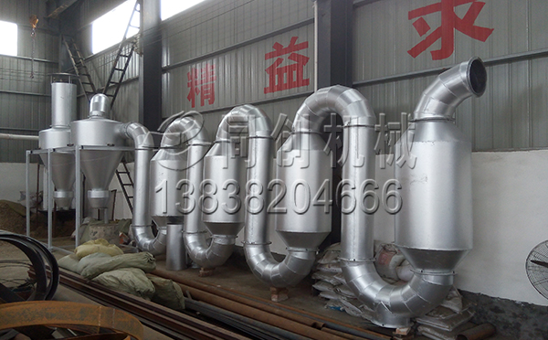 氣流式烘幹機采(cǎi)用自製可燃氣為加熱源、烘幹為 兩部分即:滾筒部、蛇形管 部。滾筒部分:內(nèi)滾筒、外 保溫兩層。內滾筒內裝有三頭(tóu)內(nèi)螺旋片,可使(shǐ)烘幹物料 均勻走動稱(chēng)為(wéi)炒製加熱,蛇 形管部二次利用熱源,采用(yòng) 引(yǐn)風機負壓抽風把烘幹物料 抽壓到(dào)螺旋器(qì)中進(jìn)行分離以 達到烘幹效果。